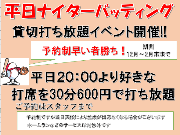 平日ナイター貸切打ち放題 投稿者:mizunosc2022年1月17日カテゴリー:未分類 共有: X で共有 (新しいウィンドウで開きます) X Facebook で共有 (新しいウィンドウで開きます) Facebook いいね 読み込み中…