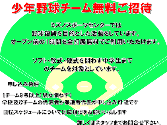 冬季貸切営業受け付中 投稿者:oouchimizuno2022年11月5日カテゴリー:未分類 バッティング貸切営業の料金は下記の通りです 全打席(7打席)1時間利用 中学生までのチーム様 4000円 大人5000円 共有: クリックして X で共有 (新しいウィンドウで開きます) X Facebook で共有するにはクリックしてください (新しいウィンドウで開きます) Facebook いいね 読み込み中…