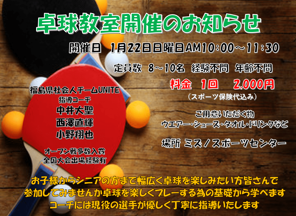 卓球教室開催が決まりました1/22ミズノスポーツセンターで10時よりスタート!! 未経験の方から経験者の方まで・お子様からシニアの方まで楽しく皆さんのスキルに合わせて社会人チームの現役選手がコーチとなり優しく丁寧にご指導致します。申し込みミズノスポーツセンターまで
