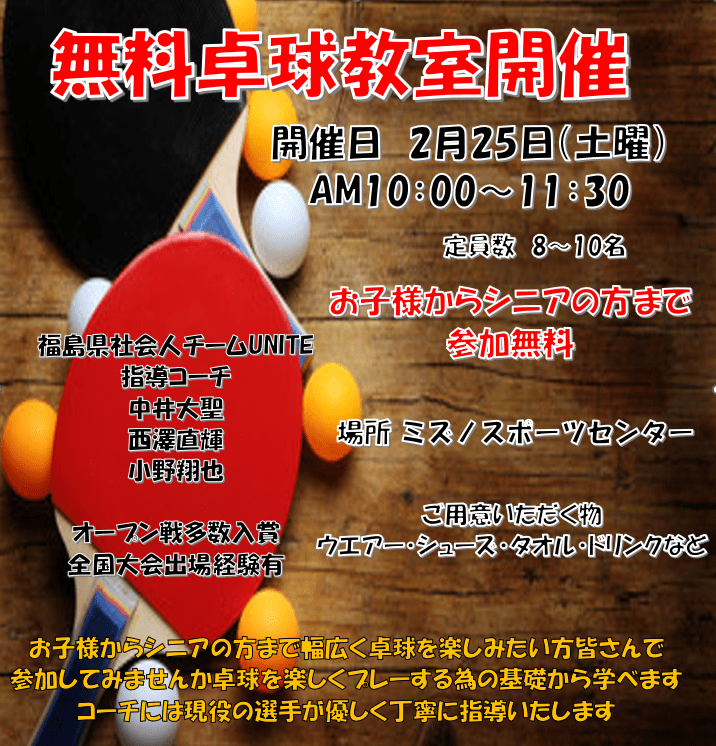 2/25無料卓球教室開催 投稿者:oouchimizuno2023年2月5日カテゴリー:未分類 お申し込みはお早めにフタッフまでお願い致します。 共有: クリックして X で共有 (新しいウィンドウで開きます) X Facebook で共有するにはクリックしてください (新しいウィンドウで開きます) Facebook いいね 読み込み中…