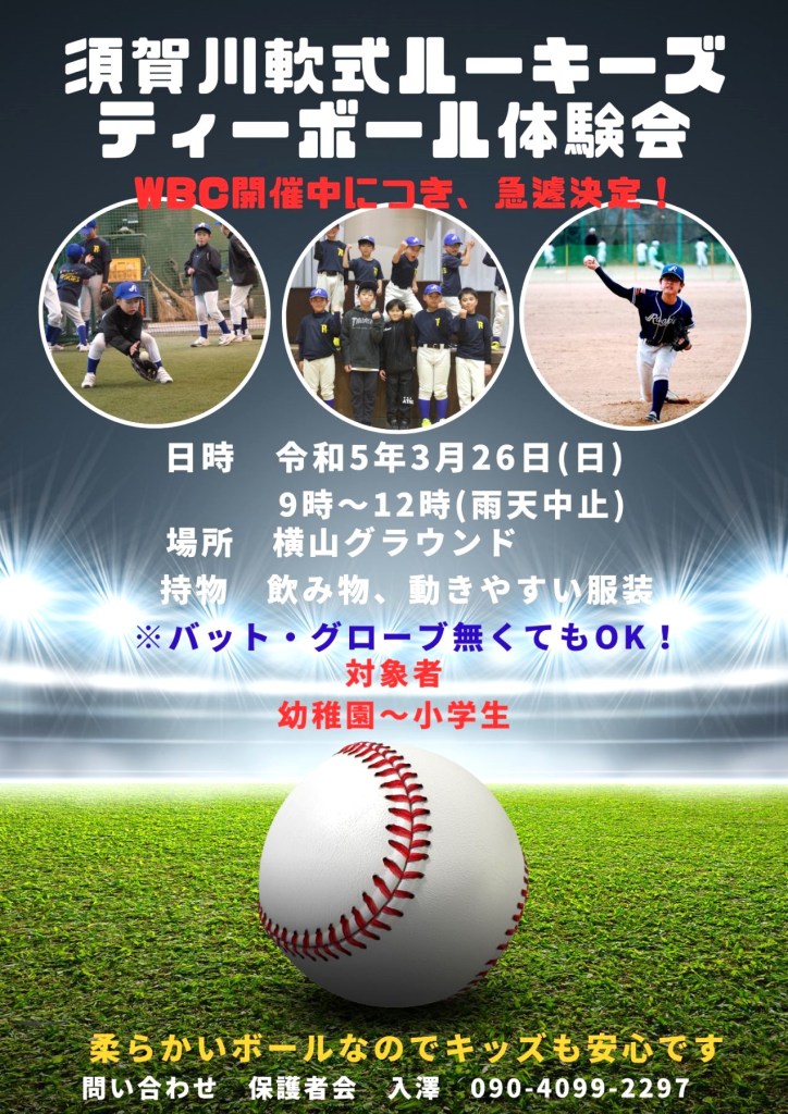 須賀川軟式ルーキーズティーボール体験 投稿者:oouchimizuno2023年3月13日カテゴリー:未分類 3/26日曜日ティーボール体験体験会を開催、野球をやってみたいキッズはポスターの連絡先までご連絡下さい。 共有: クリックして X で共有 (新しいウィンドウで開きます) X Facebook で共有するにはクリックしてください (新しいウィンドウで開きます) Facebook いいね 読み込み中…
