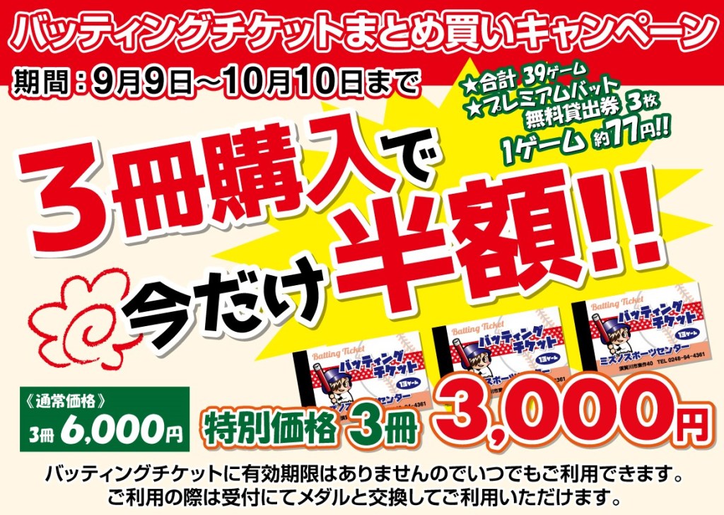バッティングチケットまとめ買いキャンペーン9/9スタート 投稿者:oouchimizuno2023年9月1日カテゴリー:未分類 ミズノスポーツ_A3半額ポスター_202009 共有: クリックして X で共有 (新しいウィンドウで開きます) X Facebook で共有するにはクリックしてください (新しいウィンドウで開きます) Facebook いいね 読み込み中…