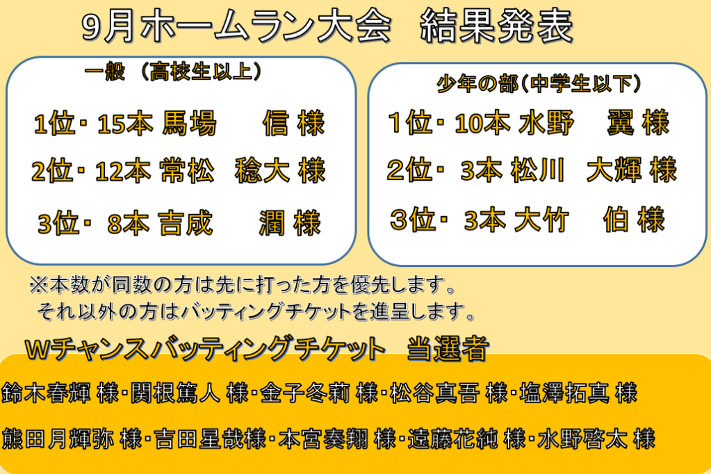 9月月間ホームラン大会結果発表 投稿者:oouchimizuno2023年10月1日カテゴリー:未分類 共有: クリックして X で共有 (新しいウィンドウで開きます) X Facebook で共有するにはクリックしてください (新しいウィンドウで開きます) Facebook いいね 読み込み中…