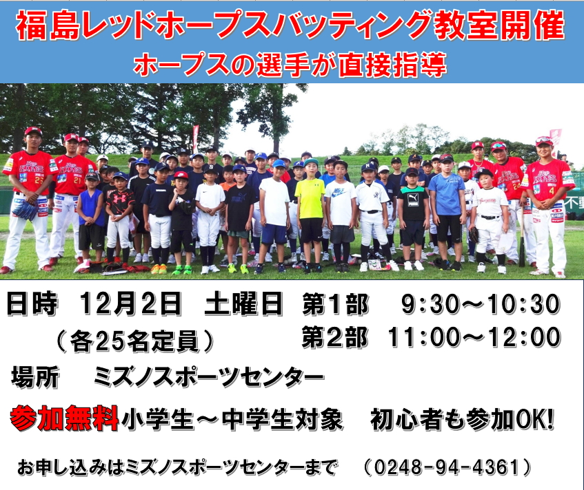 12/2 福島レッドホープス無料バッティング教室開催 投稿者:oouchimizuno2023年11月10日カテゴリー:未分類 共有: クリックして X で共有 (新しいウィンドウで開きます) X Facebook で共有するにはクリックしてください (新しいウィンドウで開きます) Facebook いいね 読み込み中…