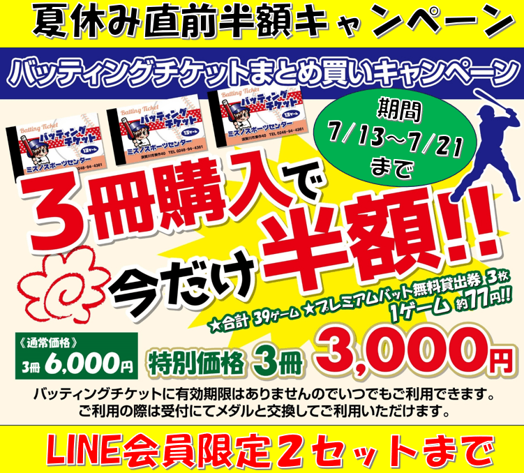 バッティングチケット半額スタート 投稿者:oouchimizuno2024年7月13日カテゴリー:未分類 共有: クリックして X で共有 (新しいウィンドウで開きます) X Facebook で共有するにはクリックしてください (新しいウィンドウで開きます) Facebook いいね 読み込み中…