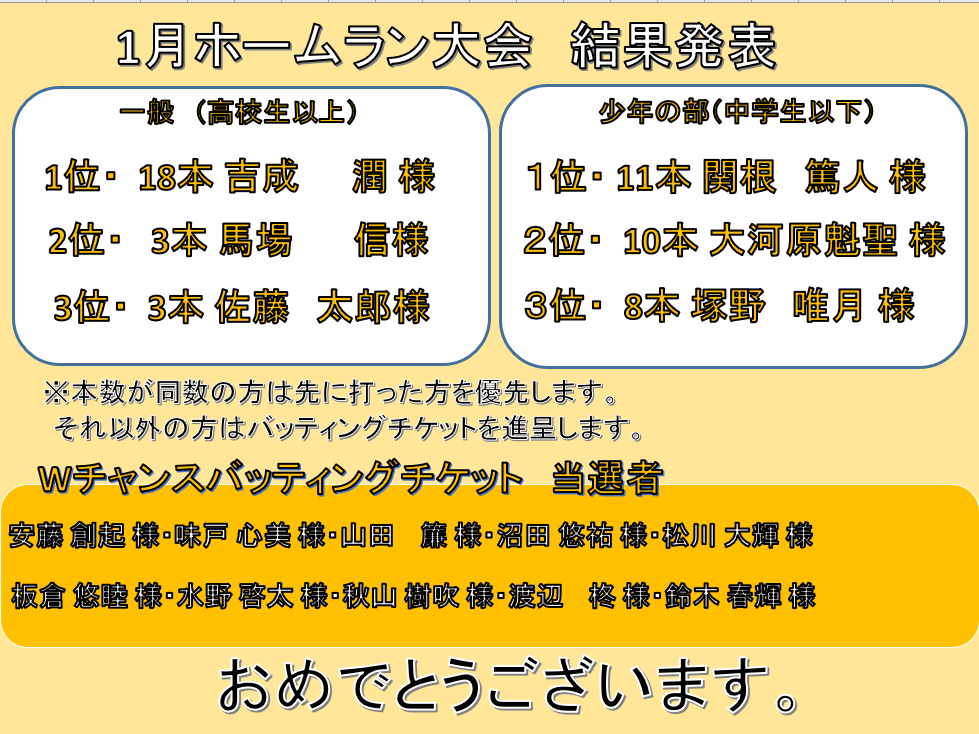 1月ホームラン結果発表 投稿者:oouchimizuno2025年2月11日カテゴリー:未分類 商品の受け取りにお越しください 共有: クリックして X で共有 (新しいウィンドウで開きます) X Facebook で共有するにはクリックしてください (新しいウィンドウで開きます) Facebook いいね 読み込み中…