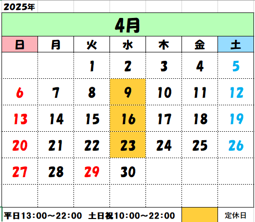 4月営業カレンダー 投稿者:oouchimizuno2025年3月30日カテゴリー:未分類 4/2・4/30は営業致します 共有: クリックして X で共有 (新しいウィンドウで開きます) X Facebook で共有するにはクリックしてください (新しいウィンドウで開きます) Facebook いいね 読み込み中…