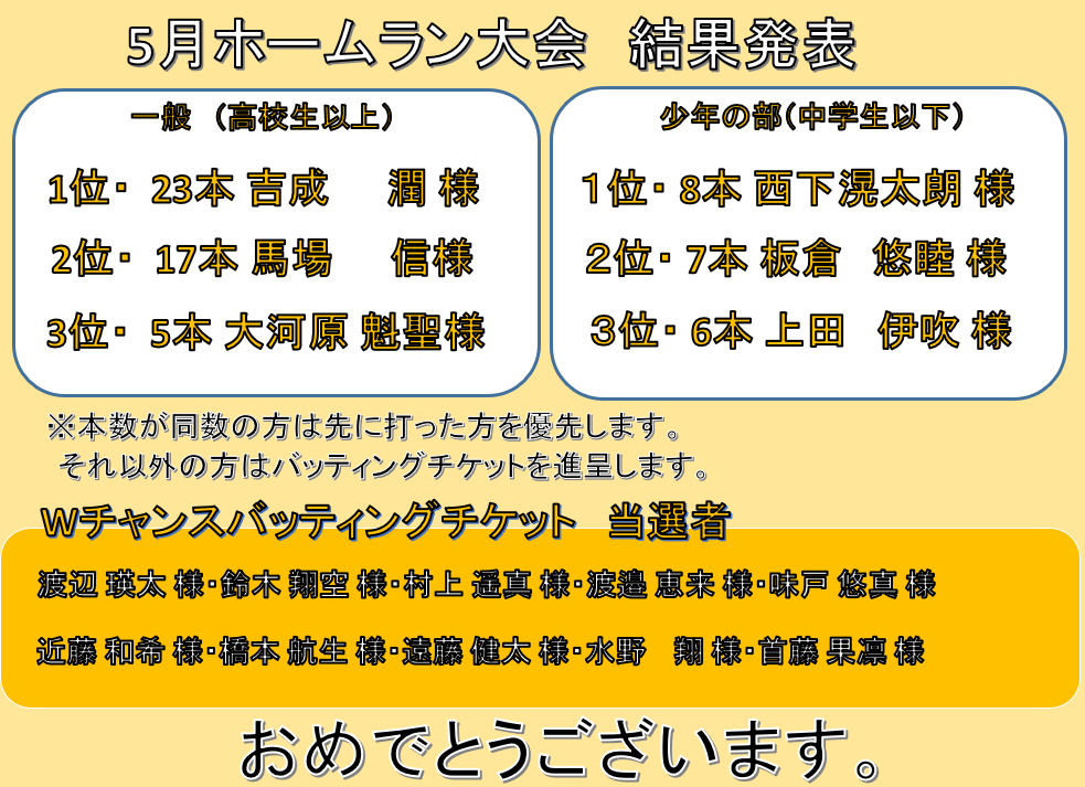5月月間ホームラン大会結果発表 投稿者:oouchimizuno2025年6月3日カテゴリー:未分類 共有: クリックして X で共有 (新しいウィンドウで開きます) X Facebook で共有するにはクリックしてください (新しいウィンドウで開きます) Facebook いいね 読み込み中…